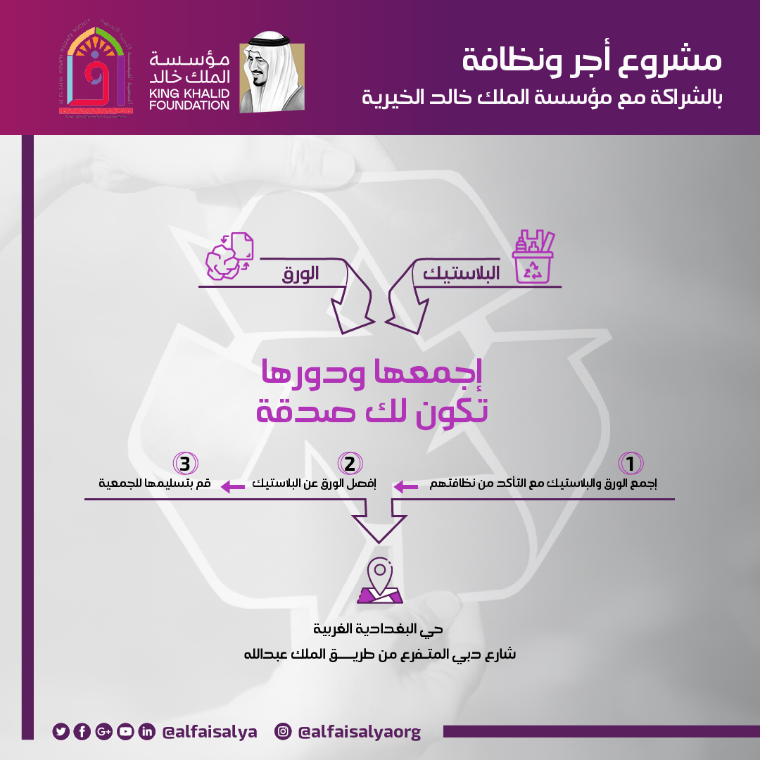 ويهدف مشروع "أجر ونظافة" إلى إعادة تدوير النفايات "الورق والبلاستيك" وتوعية وإرشاد الأسر المستفيدة من الجمعية الفيصلية وطلاب وطالبات المدارس والمجتمع المحلي بأهمية المحافظة على البيئة والعيش في مجتمع يتميز ببيئة آمنة ونظيفة والمساهمة في دعم موارد الجمعية.