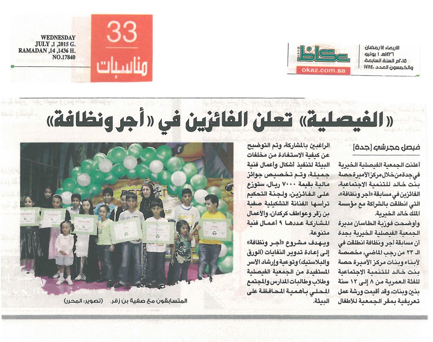 تم الإعلان عن مسابقة فنية لأبناء وبنات أسر مركز الأميرة حصة بنت خالد للتنمية الاجتماعية من عمر 8 سنوات الى عمر 12 سنه ( مسابقة مشروع أجر ونظافة للإبداع الفني ) وتتضمن المسابقة ورشة عمل لشرح شروط المسابقة وعرض كيفية الاشتراك على ان يكون العمل الفني من مخلفات البيئة. واعتماد مسابقة أجر ونظافة مسابقة سنوية.