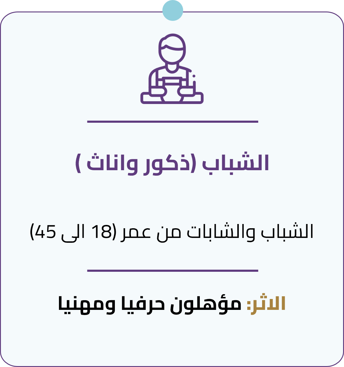 - أن يكونوا الشباب و الشابات حاصلين على الثانوية العامة العمر لايقل عن 18 و لايزيد عن 45 سنه.